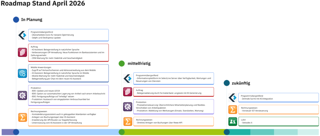 Unsere Roadmap für kommende Änderungen und neue Funktionen ist jetzt noch übersichtlicher für Sie gestaltet. Sie zeigt auf einen Blick, welche Erweiterungen als Nächstes anstehen. So wird der kommende KI-Assistent Sie künftig an verschiedenen Stellen im Programm unterstützen, etwa bei Prozessen in der OP-Verwaltung oder bei der Belegerstellung. Darüber hinaus sind zusätzliche Funktionen für BDE und die Produktion geplant. Alle weiteren Entwicklungen finden Sie in MySelect unter der Kachel „Roadmap SelectLine“, die laufend erweitert und aktualisiert wird.
