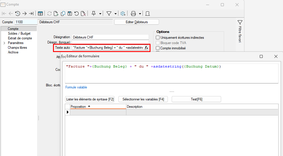 Les nouvelles fonctions dans la saisie des écritures vous permettent de travailler encore plus efficacement. Le champ « Texte automatique » dans la base de comptes permet d’enregistrer des formules qui reprennent de manière dynamique les informations issues des pièces comptables, des données comptables ou des comptes dans le texte comptable. Les modifications sont automatiquement prises en compte, tant pour la comptabilisation en ligne que pour la comptabilisation par lots. Grâce aux variables étendues, une grande partie des saisies manuelles est supprimée et les textes comptables récurrents sont automatisés de manière fiable.