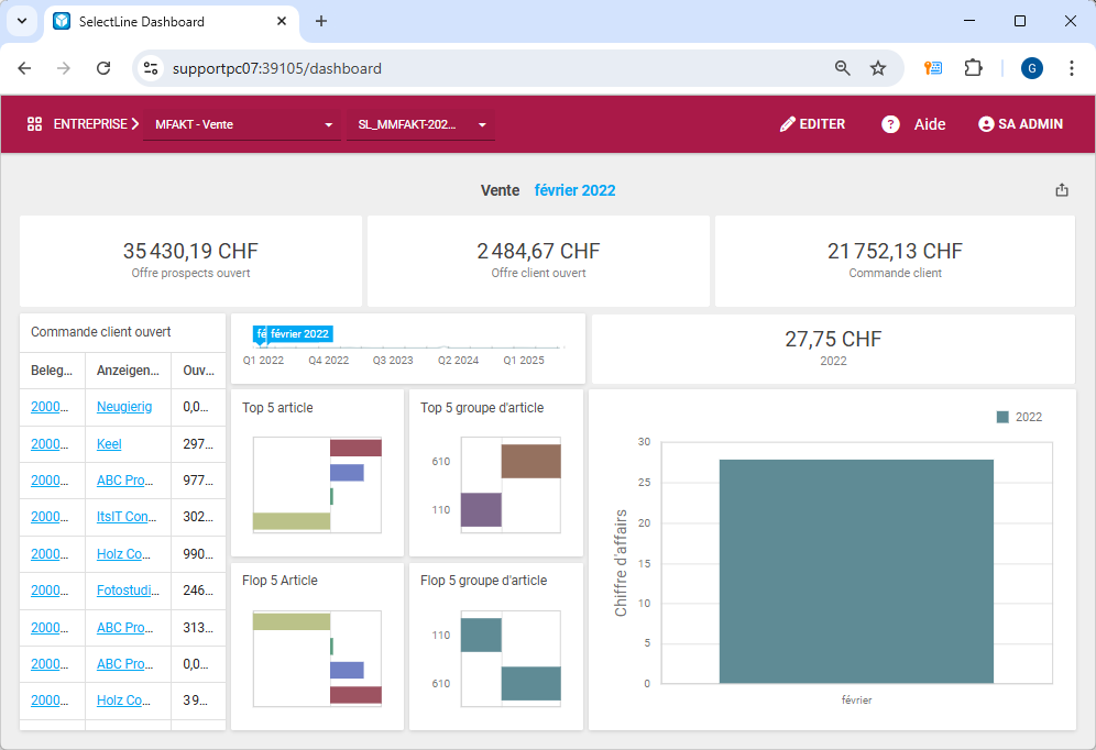 Le célèbre Dashboard de SelectLine peut désormais être ouvert directement dans le navigateur, indépendamment des applications SelectLine. Il est également optimisé pour les appareils mobiles. Vous pouvez ainsi consulter vos indicateurs clés à tout moment, que vous soyez en déplacement ou sur votre lieu de travail. En plus d’autres améliorations, notre tableau de bord permet désormais de se connecter à différents systèmes de bases de données et dispose de fonctions d’exportation et d’importation !