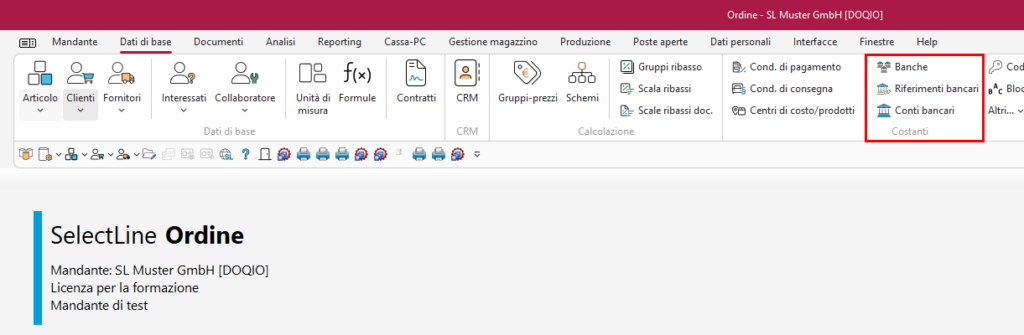 Come primo passo, dovete creare un nuovo conto bancario nel vostro programma SelectLine. A tal fine, andate alla scheda Dati di base e create un nuovo conto bancario sotto “Conti bancari”.