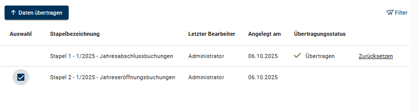 Mit wenigen Klicks übertragen Sie Ihre vorbereiteten Stapel ins SelectLine Rechnungswesen. Der Übertragungsstatus zeigt Ihnen jederzeit, ob Ihre Daten erfolgreich bereitgestellt wurden. Bereits übertragene Stapel sind dort sofort für die weitere Bearbeitung sichtbar.